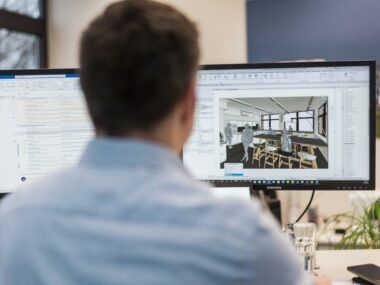 Schulterblick auf 2 Bildschirme. Es wird mit Revit gearbeitet